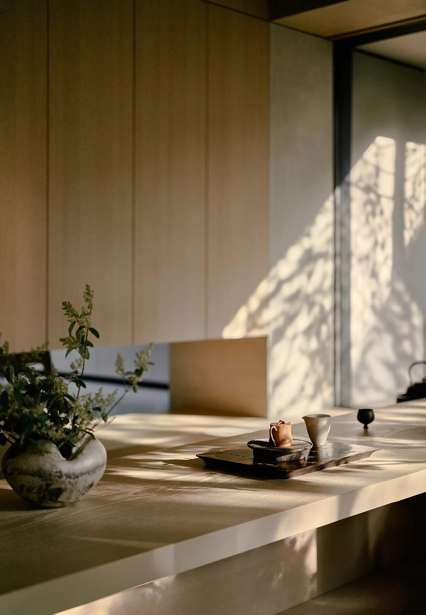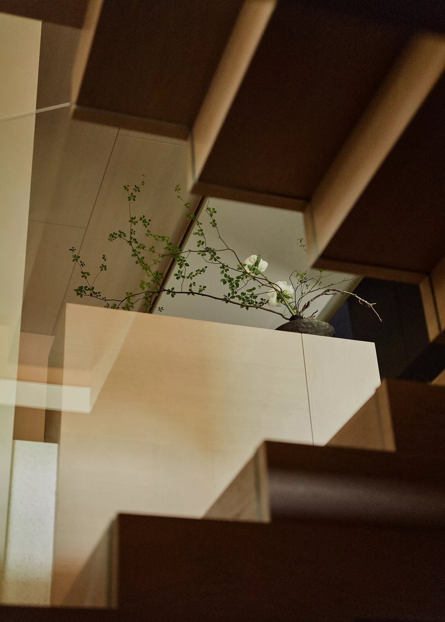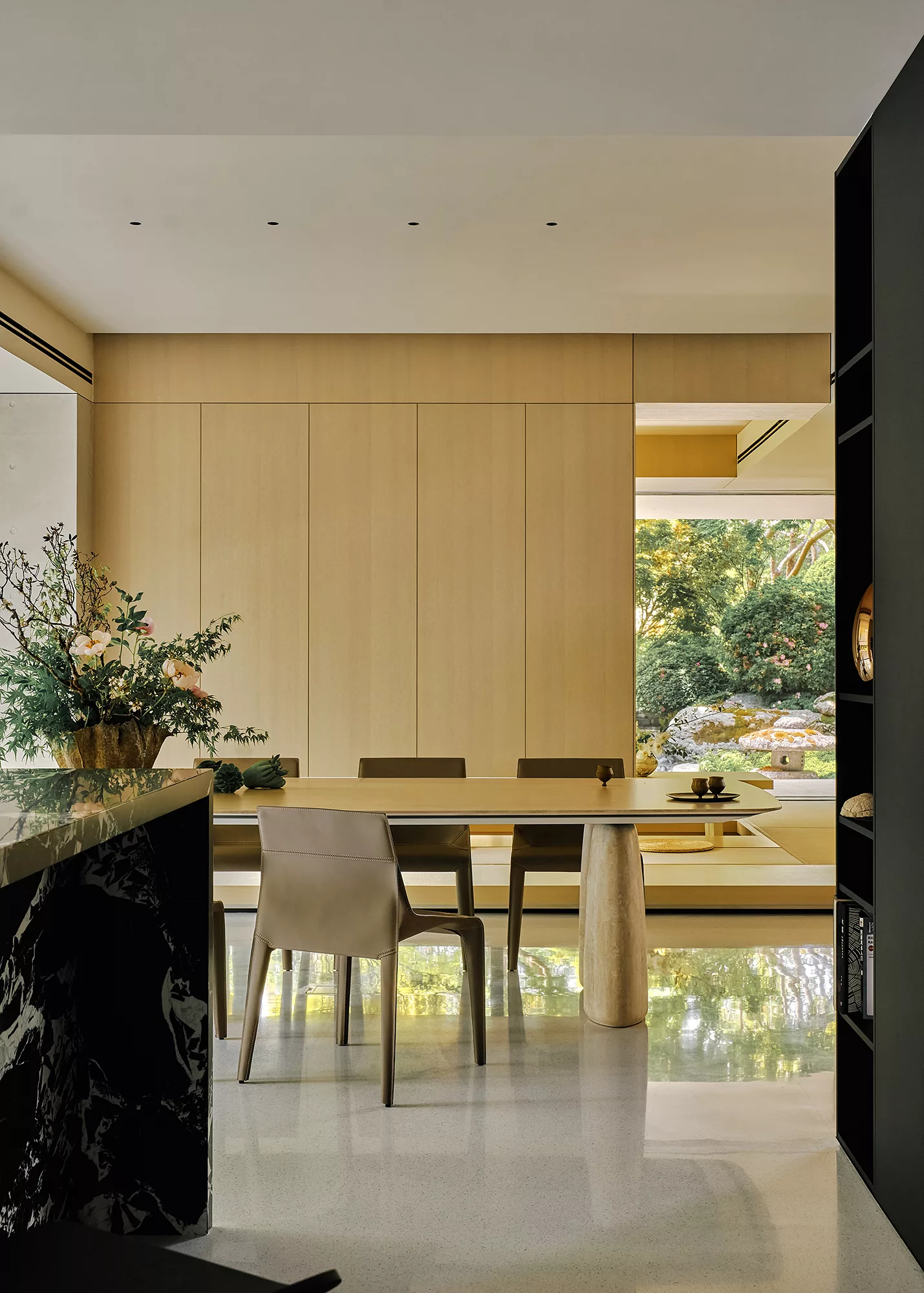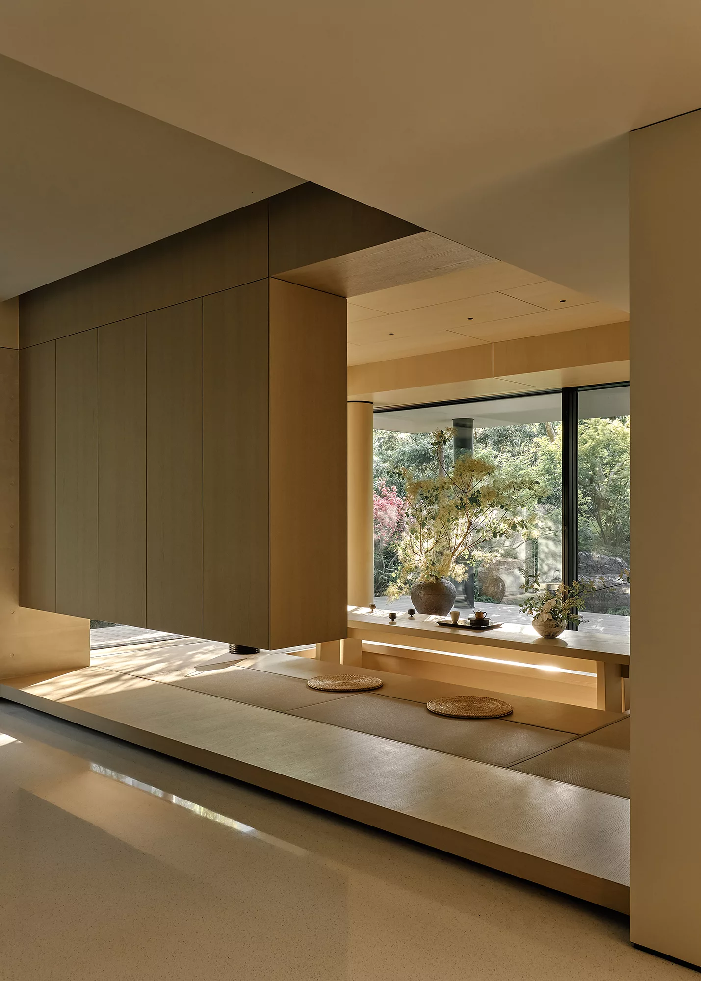 “谧庭”与“光叙”,看似是设计的两面,其实是一件事情。有树才有影,而影与光的此消彼长,才造就了空间里“光”的叙事。光,不仅指第一次照进来的光,还有反射、漫射、这些弥漫的光,与不同材料发生共振,哑光之域,有镜生辉。