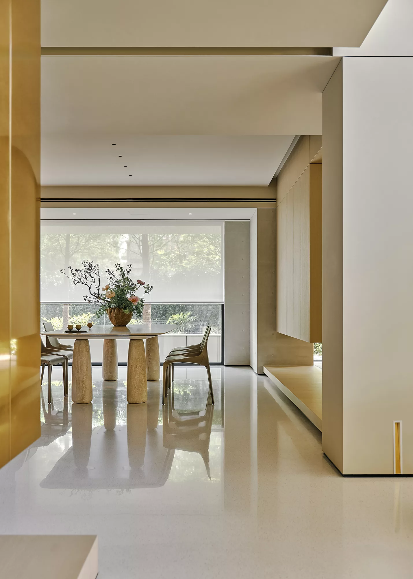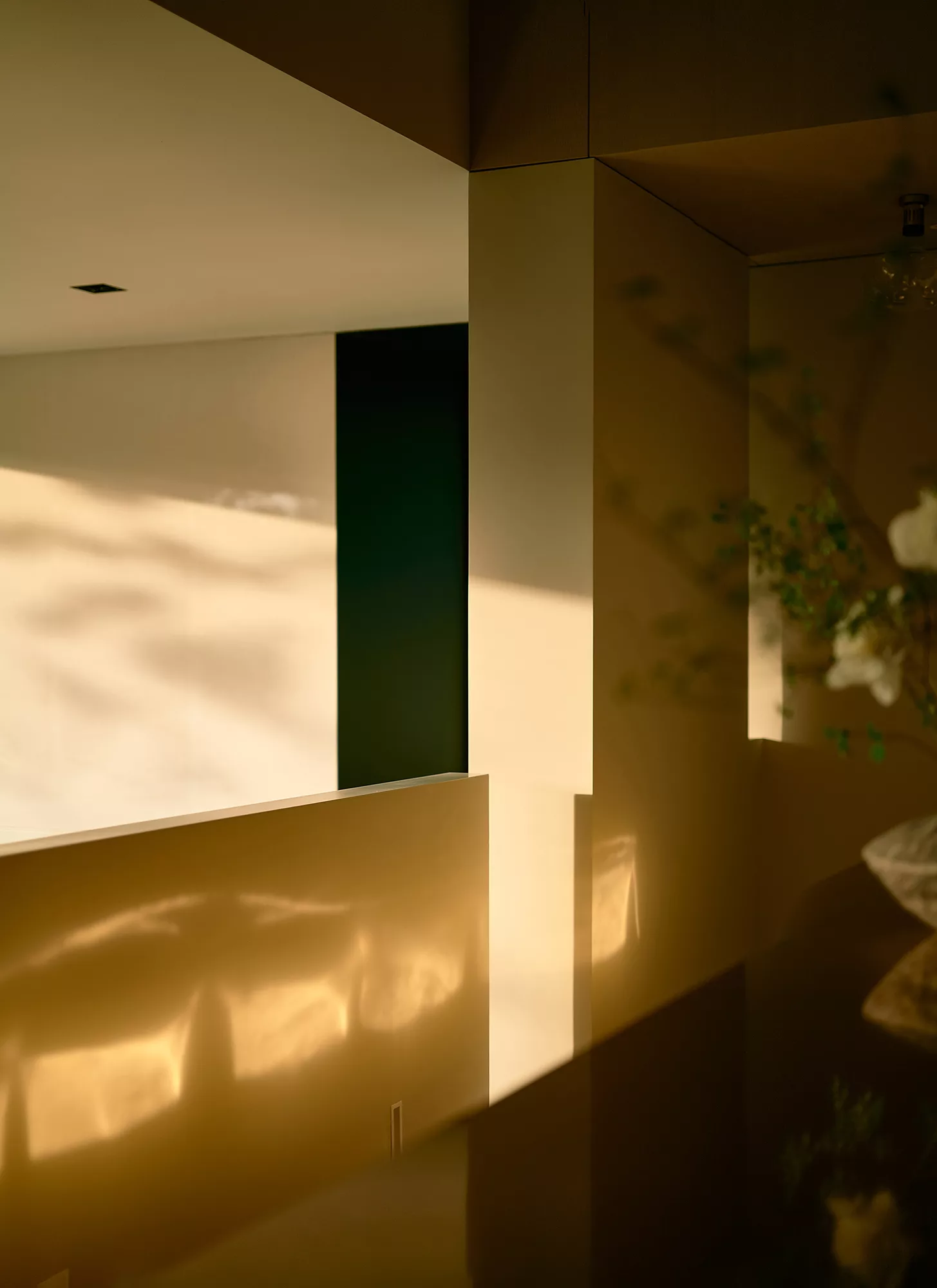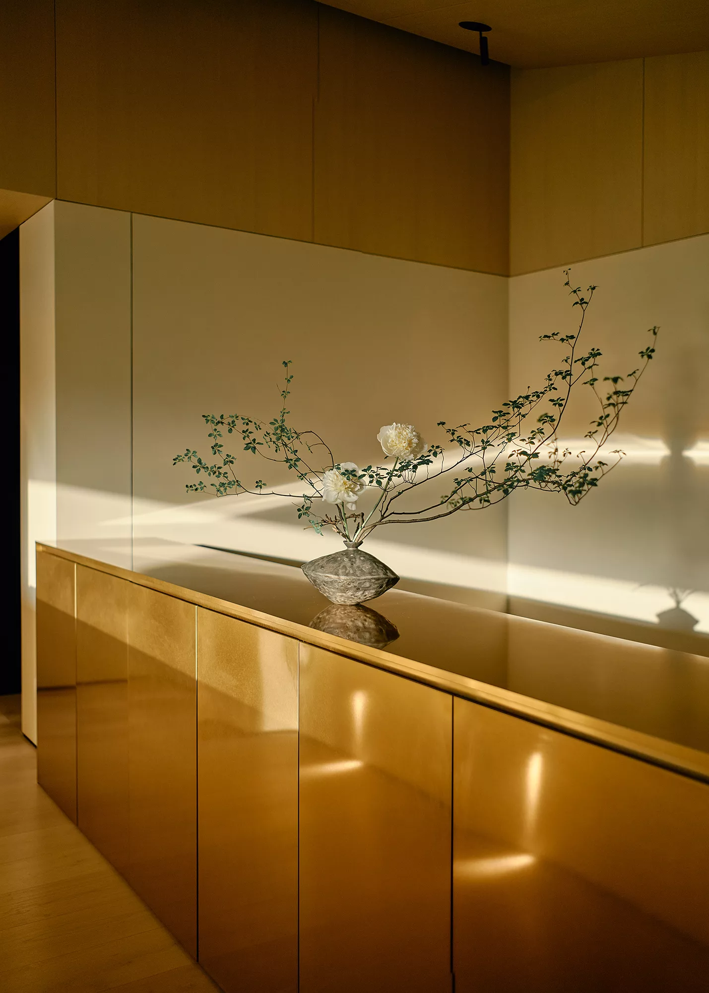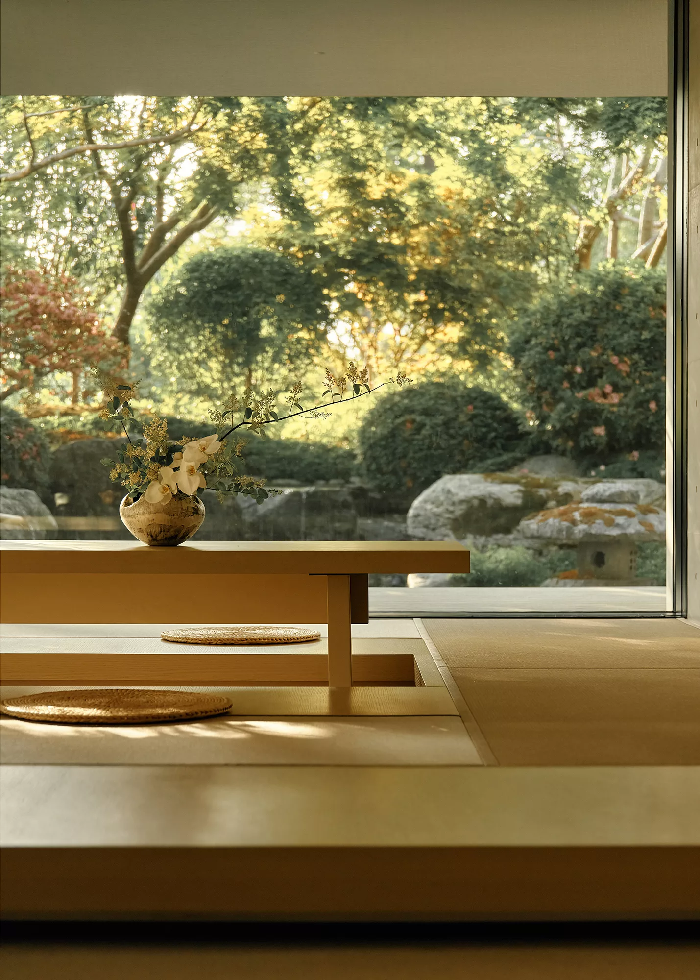 “谧庭”与“光叙”,看似是设计的两面,其实是一件事情。有树才有影,而影与光的此消彼长,才造就了空间里“光”的叙事。光,不仅指第一次照进来的光,还有反射、漫射、这些弥漫的光,与不同材料发生共振,哑光之域,有镜生辉。