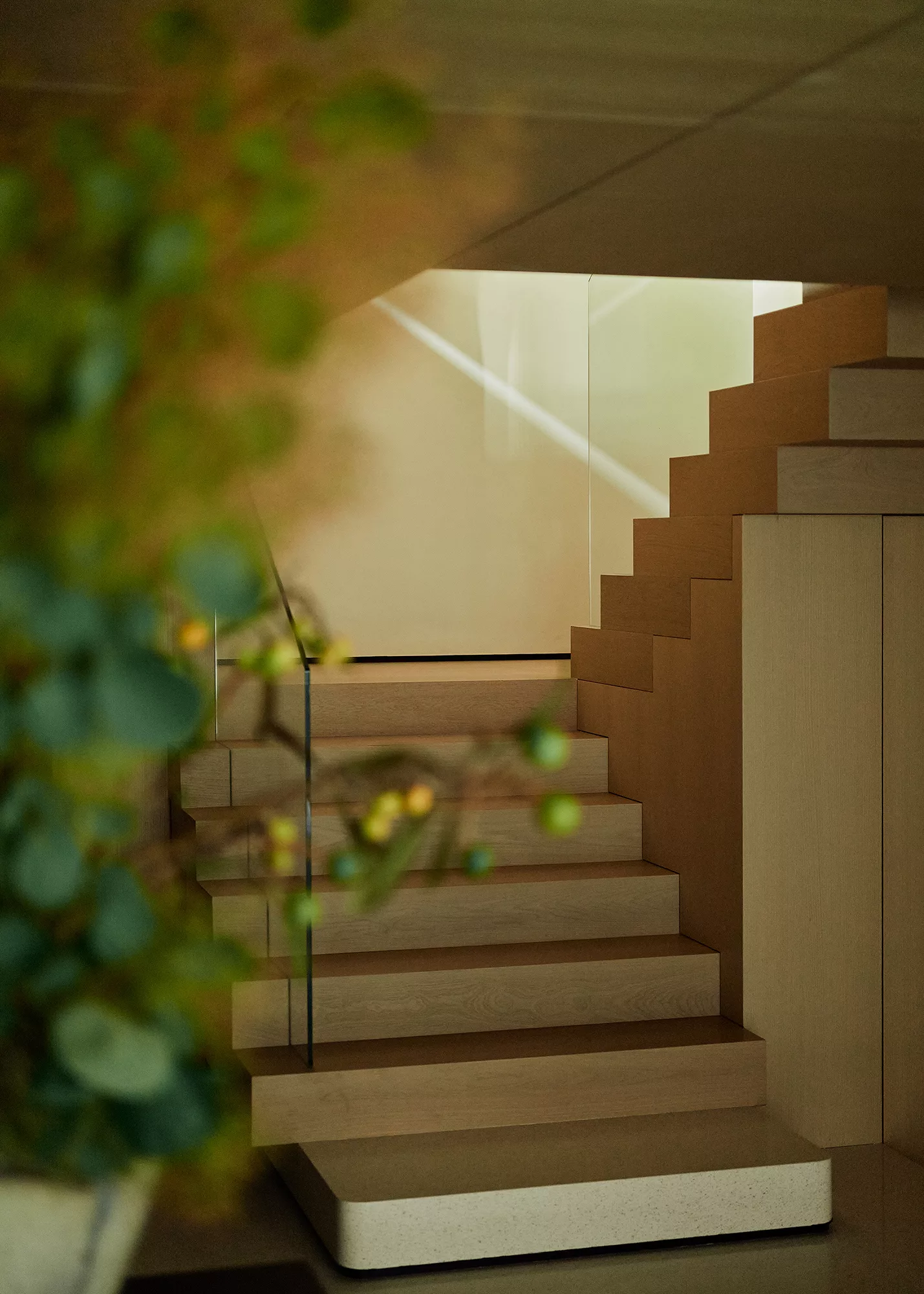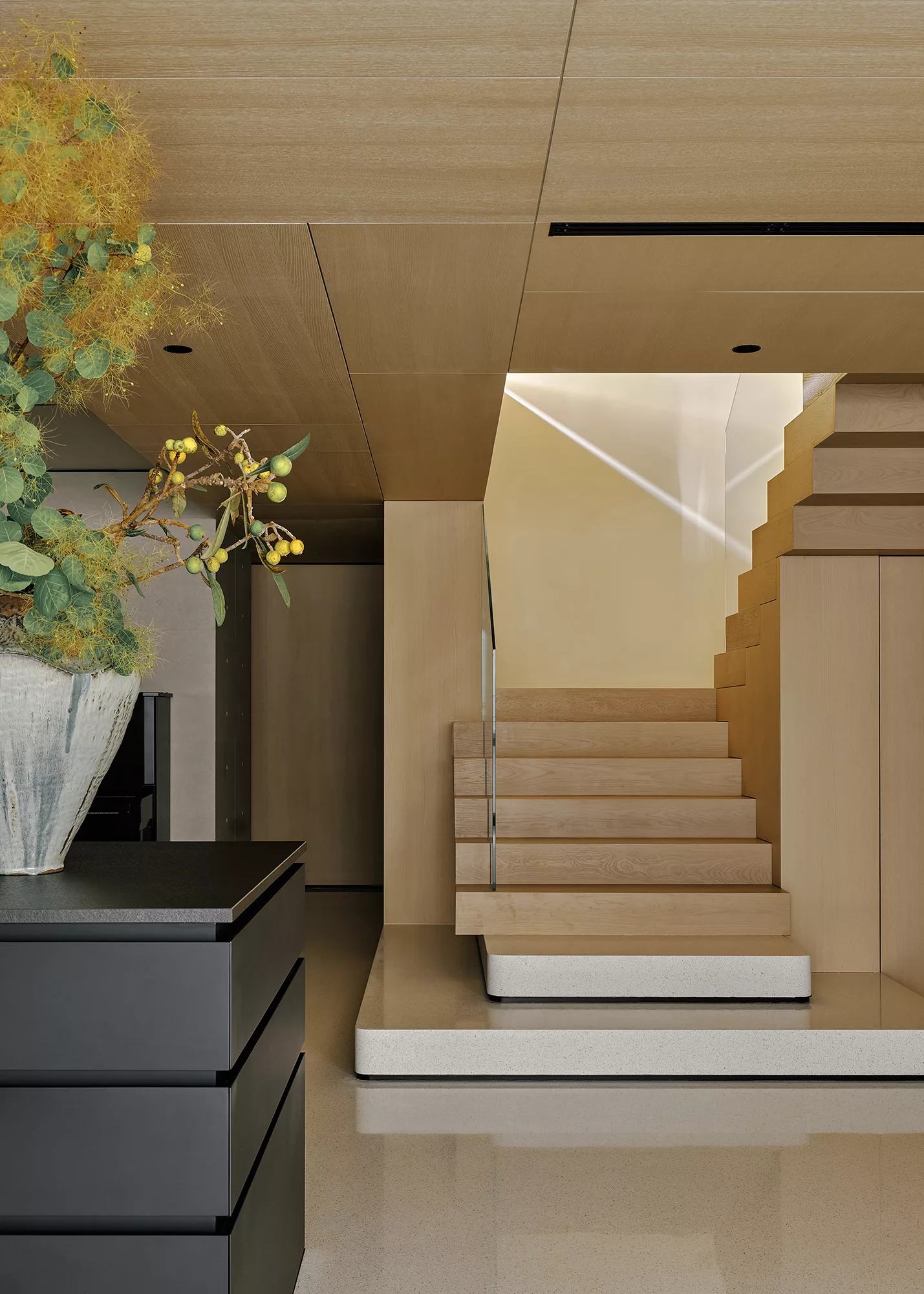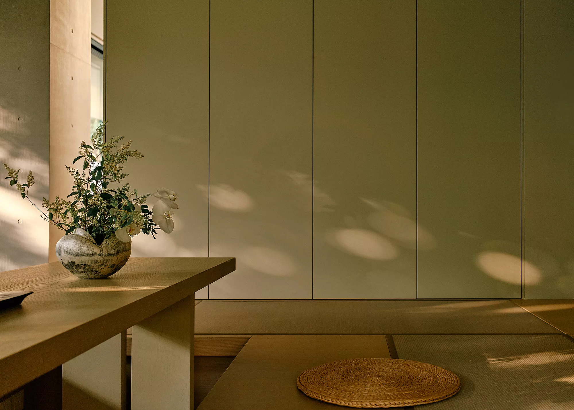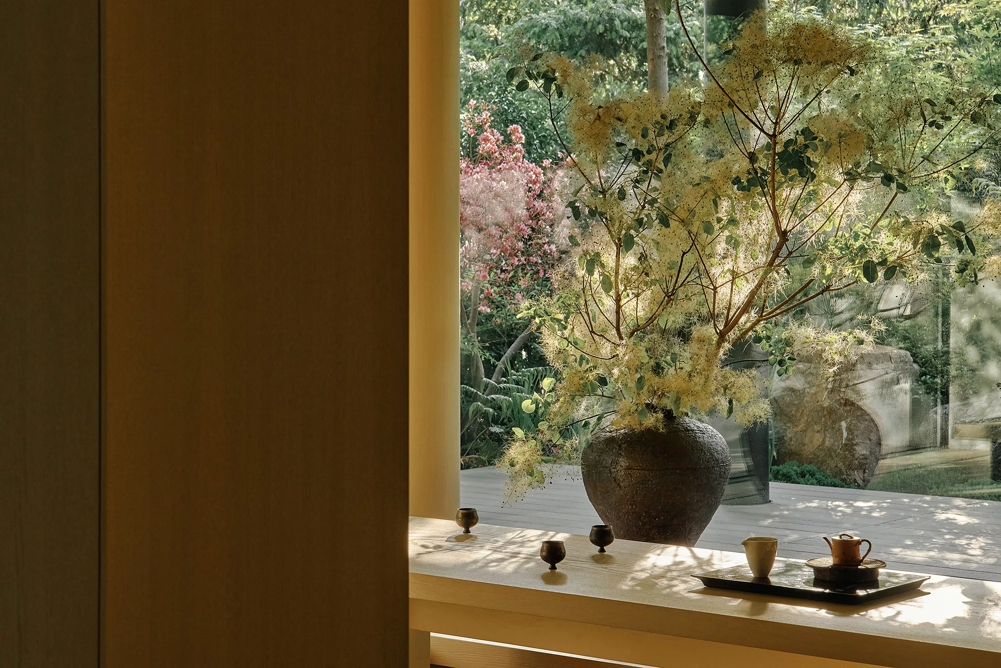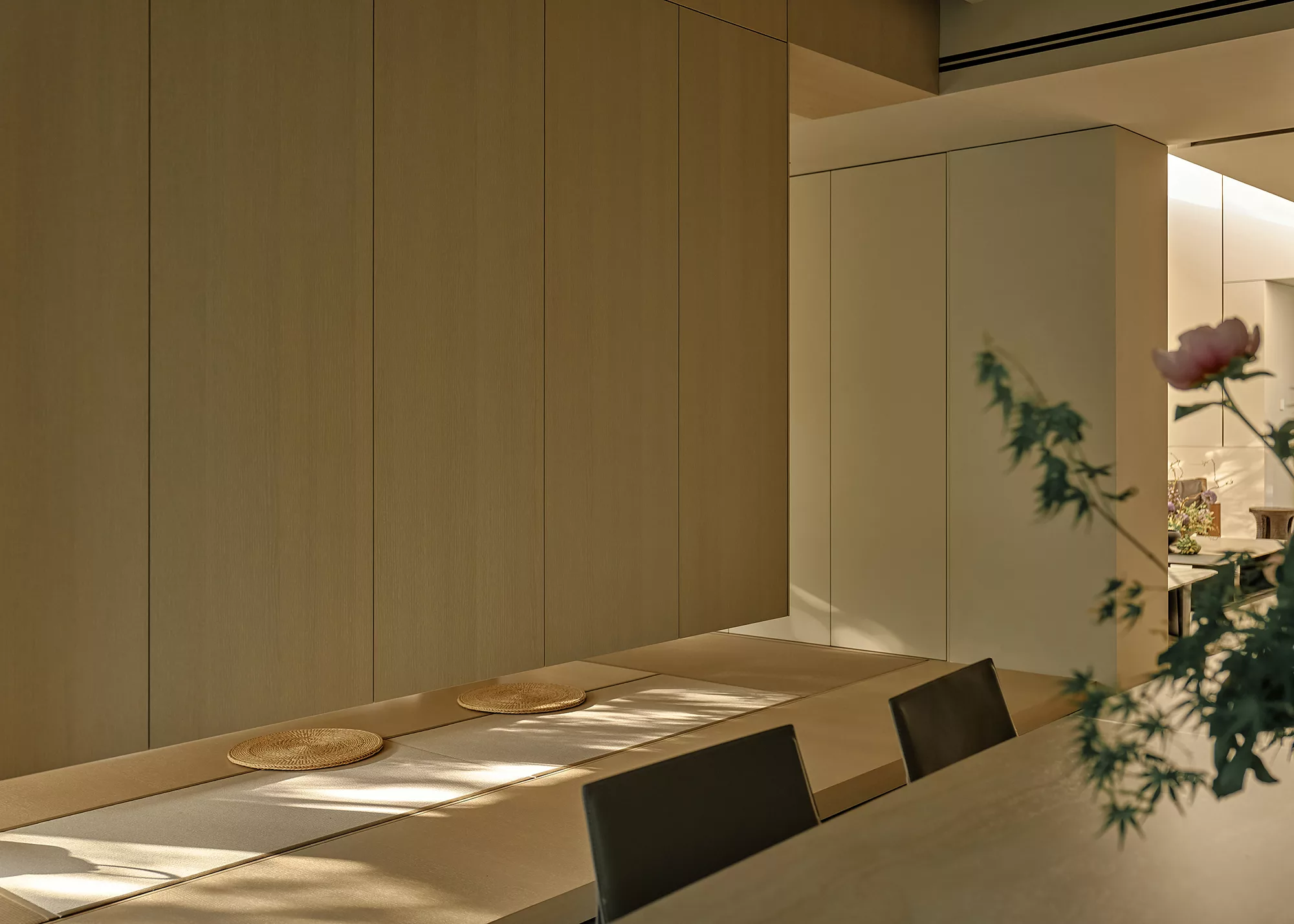 “谧庭”与“光叙”,看似是设计的两面,其实是一件事情。有树才有影,而影与光的此消彼长,才造就了空间里“光”的叙事。光,不仅指第一次照进来的光,还有反射、漫射、这些弥漫的光,与不同材料发生共振,哑光之域,有镜生辉。